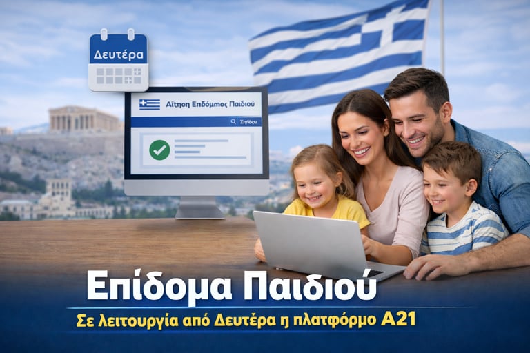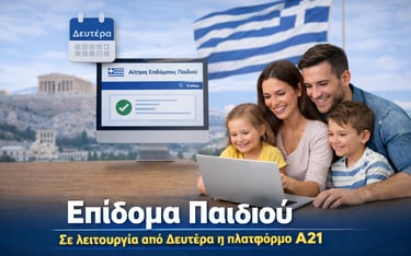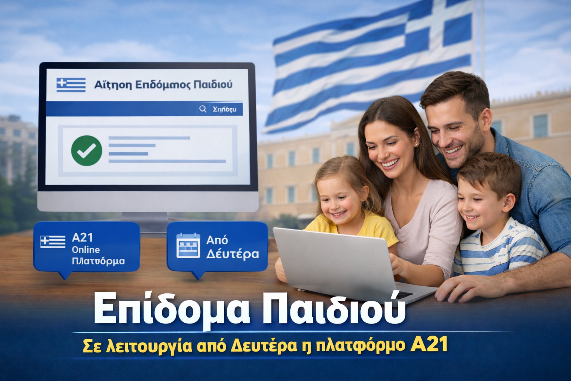 Το Υπουργείο Κοινωνικής Συνοχής και Οικογένειας, σε συνεργασία με τον ΟΠΕΚΑ, ανακοινώνει την ενεργοποίηση της ηλεκτρονικής πλατφόρμας Α21 για το Επίδομα Παιδιού. Η υποβολή αιτήσεων ξεκινά τη Δευτέρα 22 Δεκεμβρίου 2025 στις 08:00.